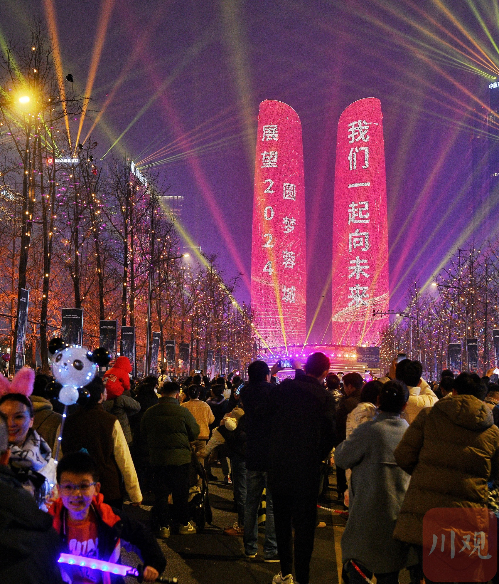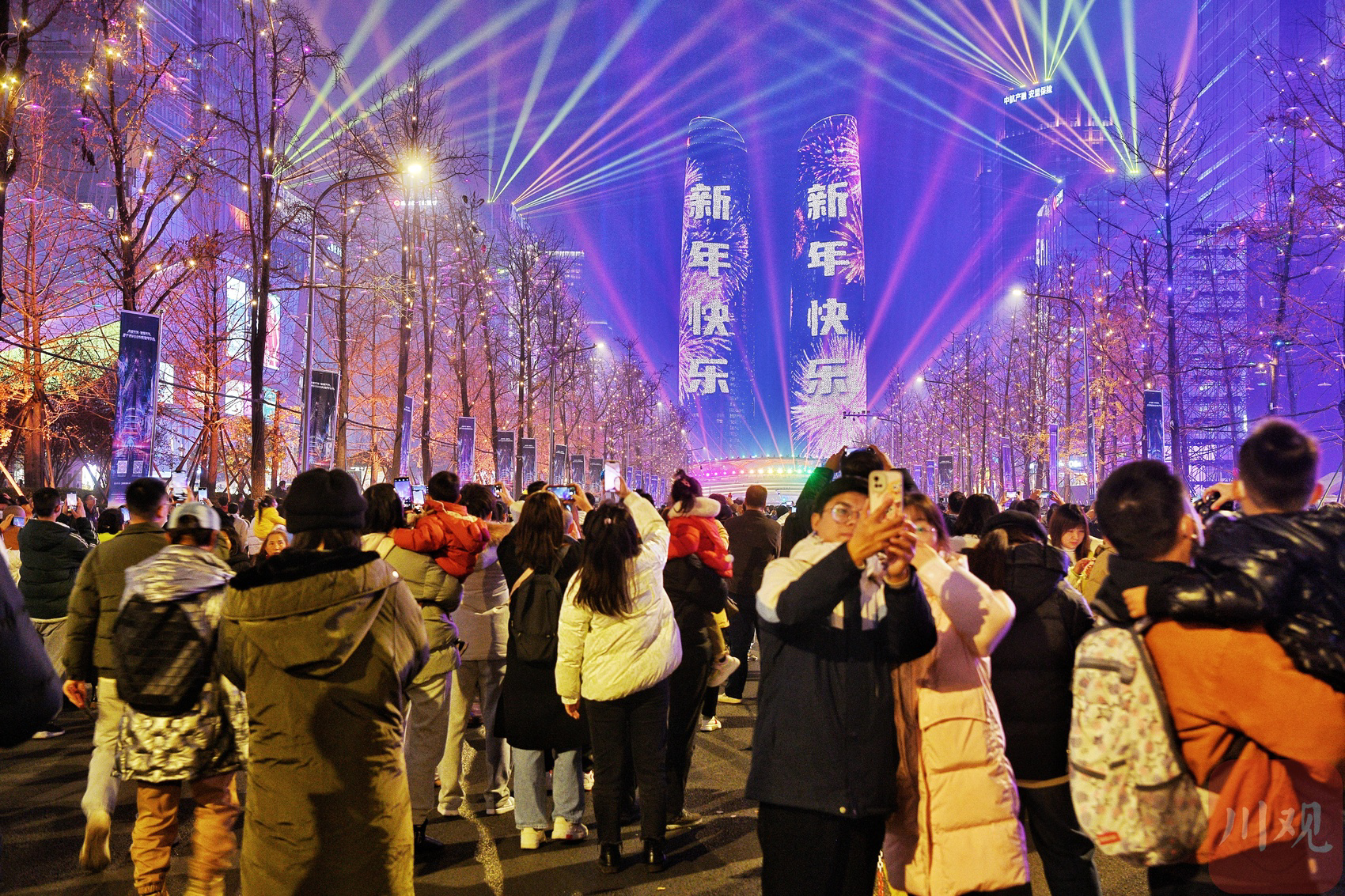 2023年12月31日晚,成都交子大道、双子塔灯光璀璨,市民涌上街头在炫酷节奏中喜迎2024新年的到来。