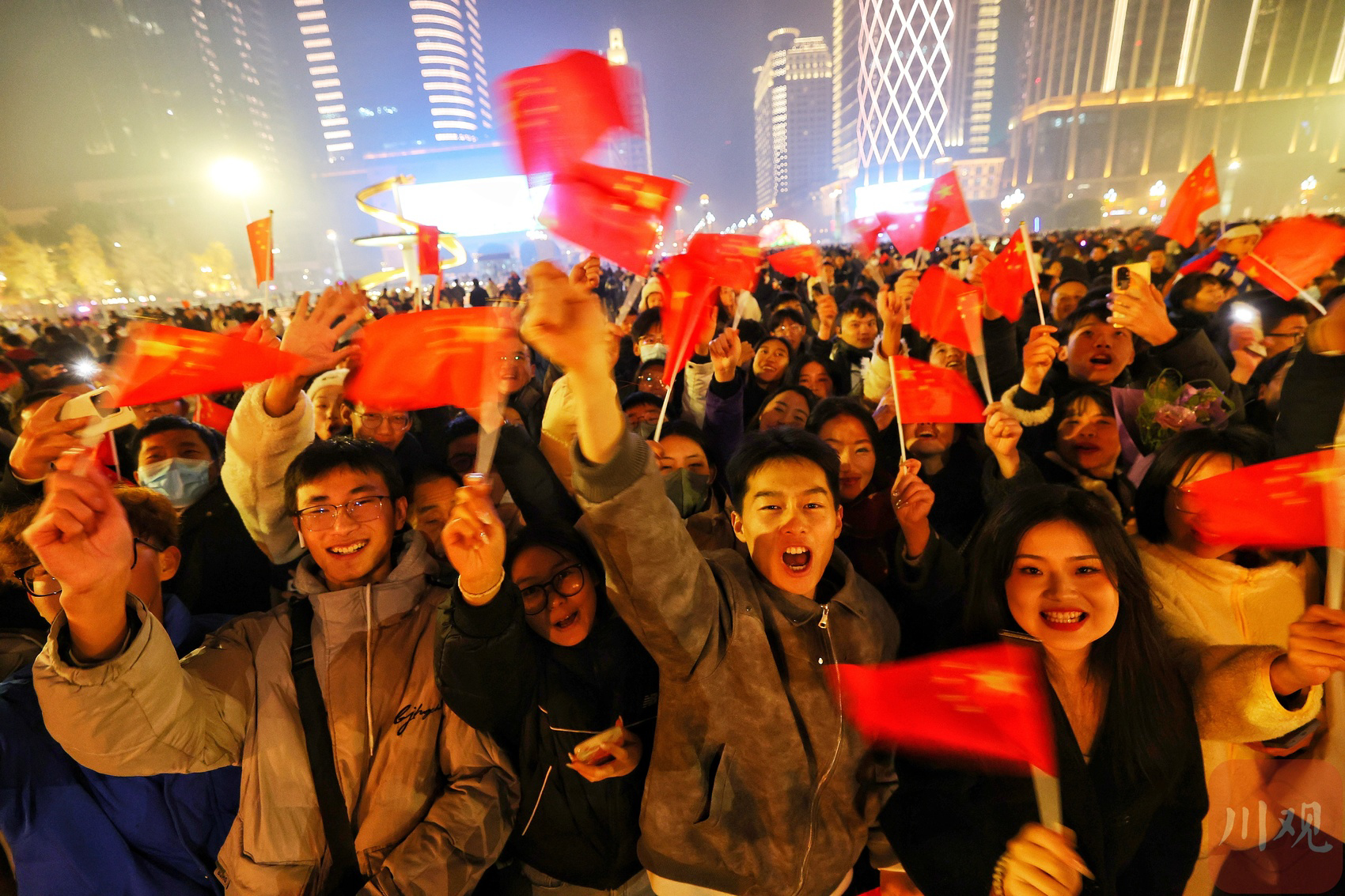 2024年1月1日,元旦节的清晨,市民们齐聚成都天府广场,观礼新年的升旗仪式。