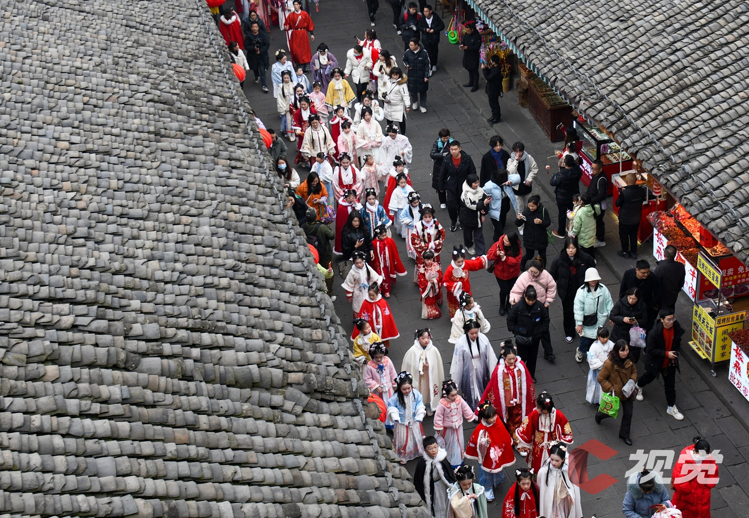 元旦假期,南充市阆中古城举行了丰富多彩的民俗活动,吸引了众多游客。2023年12月31日,身着传统服饰的人们在古城内巡游,欢度元旦假期。(C视觉摄影师 王玉贵 摄)