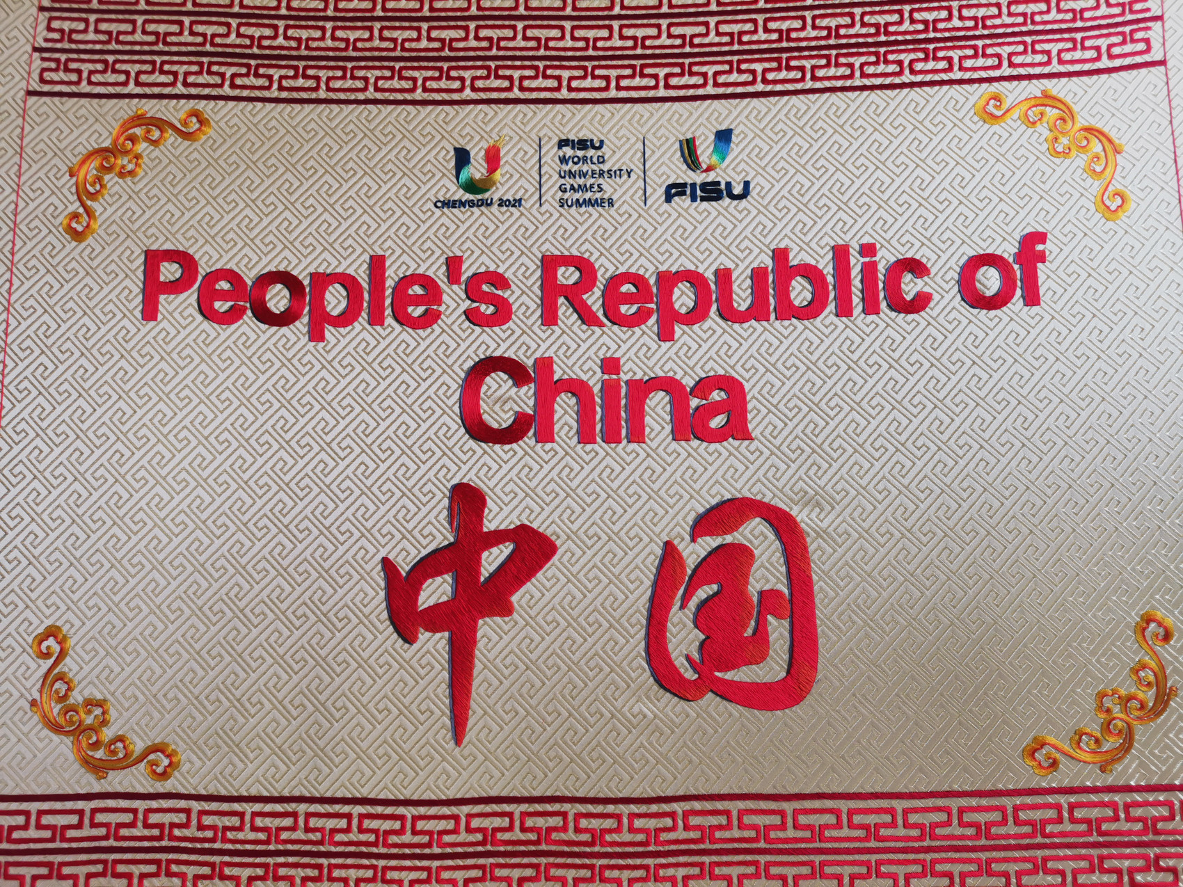 在刚刚过去的2023年,郝淑萍还是成都大运会的一位特别参与者,她运用传统的蜀绣工艺,在蜀锦上刺绣各个代表团的引导牌,从而寄托“锦绣之路”的美好寓意。郝淑萍表示,在刺绣中,文字是不好绣的,一不小心就会出现歪斜、变形等情况,“我们在绣代表团名字的时候,会借助尺子来确保文字的横平竖直。同时,我们会通过针线的层层堆叠来增强文字的立体感。”