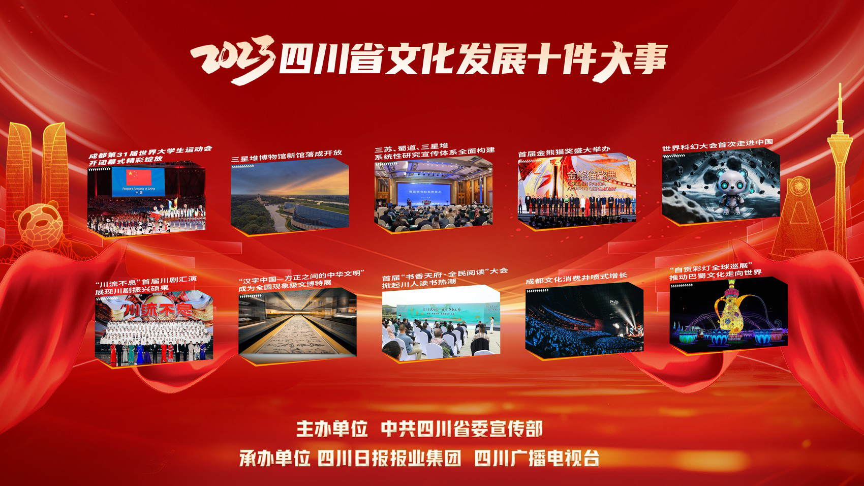 1月2日,2023四川省文化发展十件大事评选活动发布仪式在成都举行,正式发布了十件彰显全省文化事业产业蓬勃发展的大事。成都第31届世界大学生运动会开闭幕式精彩绽放,三星堆博物馆新馆落成开放,三苏、蜀道、三星堆系统性研究宣传体系全面构建,首届金熊猫奖盛大举办,世界科幻大会首次走进中国,“川流不息”首届川剧汇演展现川剧振兴硕果,“汉字中国——方正之间的中华文明”成为全国现象级文博特展,首届“书香天府·全民阅读”大会掀起川人读书热潮,成都文化消费井喷式增长,“自贡彩灯全球巡展”推动巴蜀文化走向世界。这十件大事,成为2023四川省文化发展鲜活注脚。