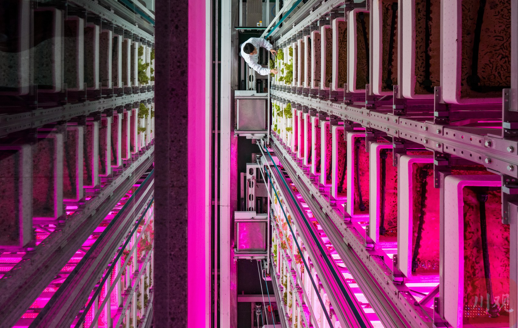 1月2日,成都国家现代农业产业科技创新中心,科研人员在查看无人化垂直植物工厂内蔬菜的生长情况。