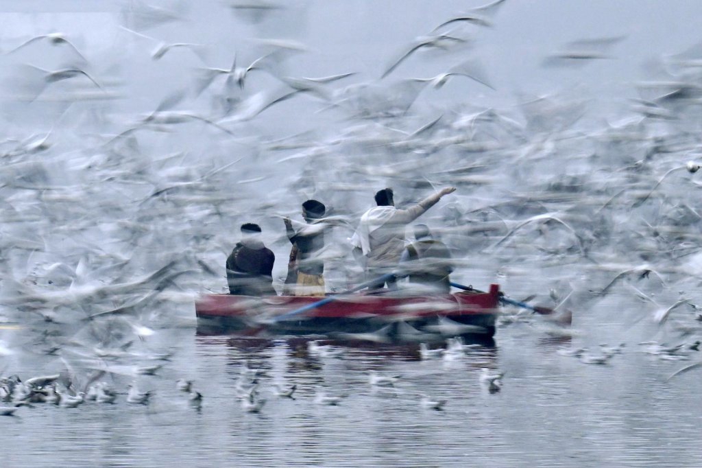 1月5日,海鸥在印度新德里亚穆纳河上飞翔。