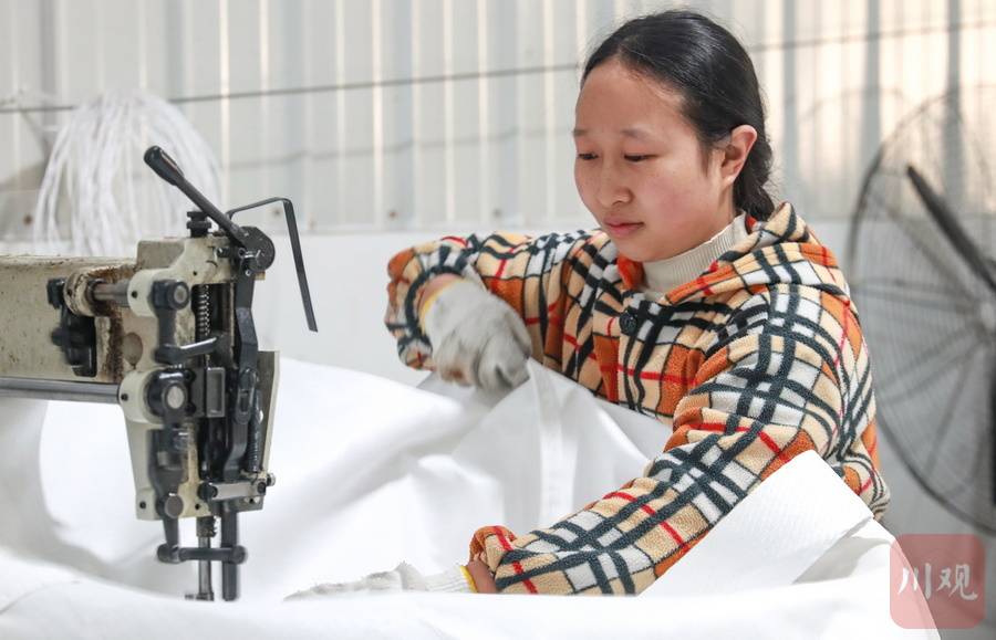 回隆村村民胡剑飘的工作是为白色塑料编织袋缝边,一天做30个编织袋,计件月收入在4000元左右。从家里出发走10分钟就能到工作地点,她对这个工作很满意,“还要再加把劲,让制作速度再快点。”