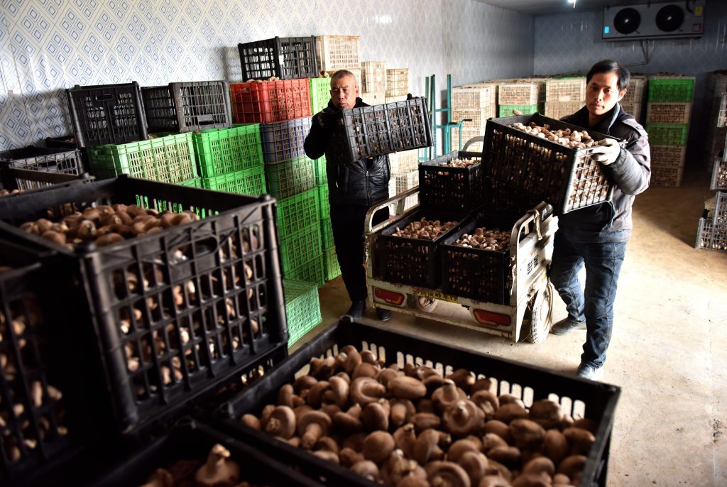 1月8日,村民在邢台市南和区东三召乡一家食用菌种植基地将采收香菇装进冷库存放。