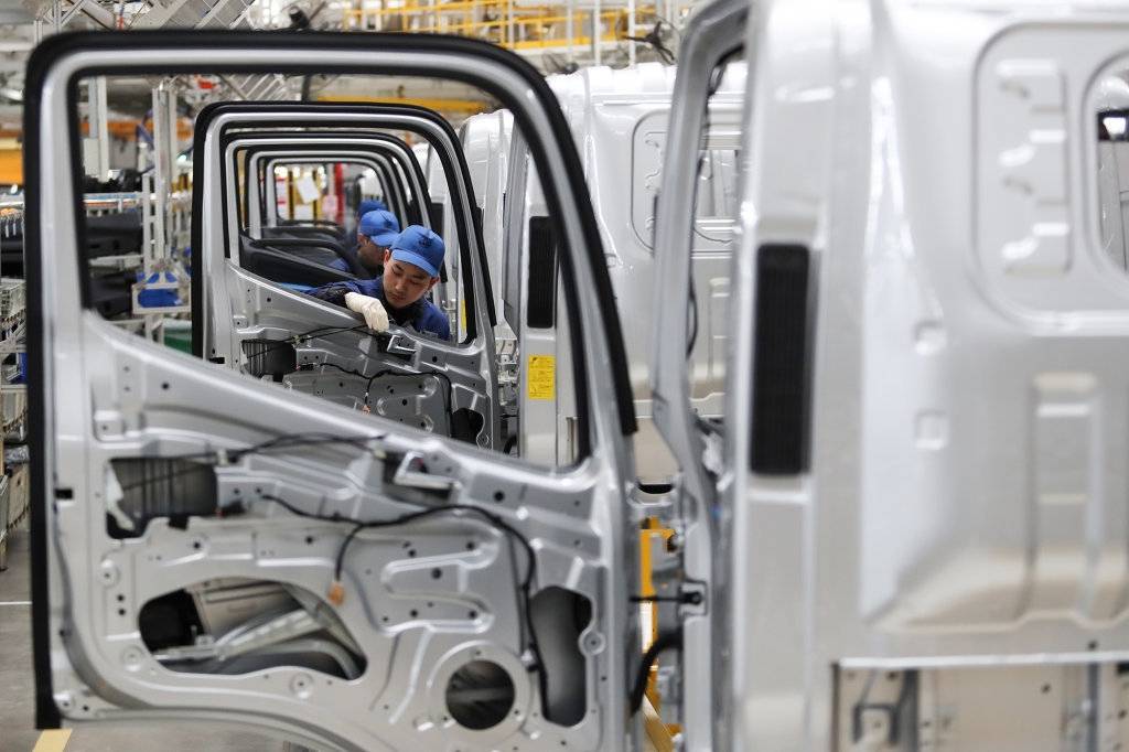 8日,首批商丘地产新能源轻卡车在位于河南省商丘市豫商经济技术开发区现代装备制造产业基地的河南福田智蓝新能源汽车组装车间下线。