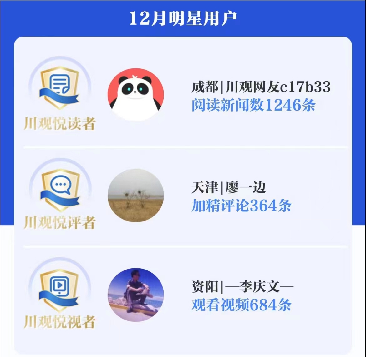 恭喜2023年12月川观明星用户