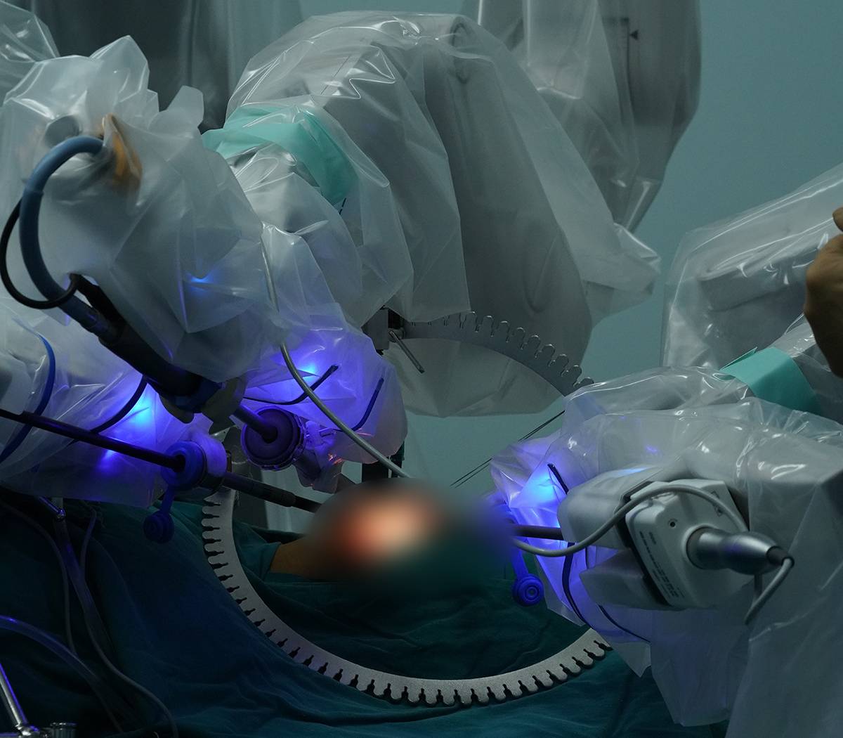 手术台上,3只机械臂正在工作