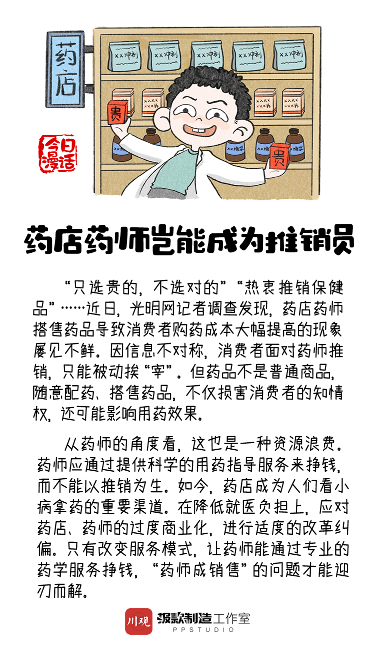近日,光明网记者调查发现,药店药师搭售药品导致消费者购药成本大幅提高的现象屡见不鲜。药师应通过提供科学的用药指导服务来挣钱,而不能以推销为生。你怎么看?