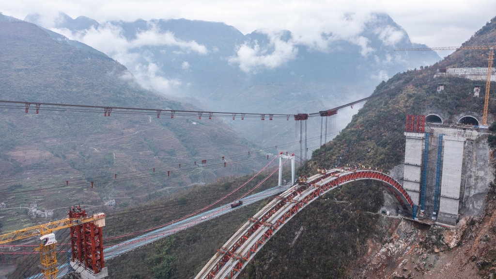 纳晴高速乌蒙山大桥主拱圈右幅顺利合龙(1月11日摄,无人机照片)。
