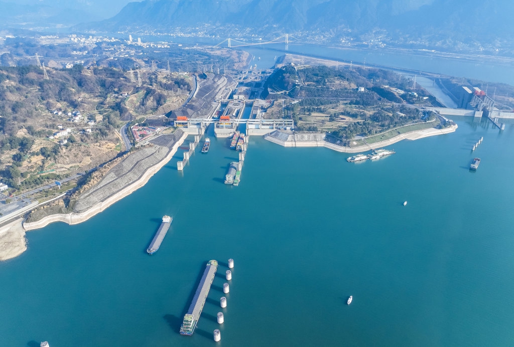 在湖北省宜昌市,船舶有序通过三峡双线五级船闸(2024年1月11日摄,无人机照片)。