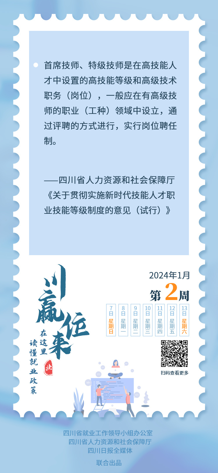 至于首席技师、特级技师,由四川省人力资源和社会保障厅牵头统筹市(州)、用人单位有序开展评聘。其中,特级技师评聘在龙头企业、大型企业先行试点的基础上逐步扩大范围,首席技师从特级技师中产生,且首席技师须是在技术技能领域作出重大贡献,或本地区、本行业企业公认具有高超技能、精湛技艺的高技能人才。
