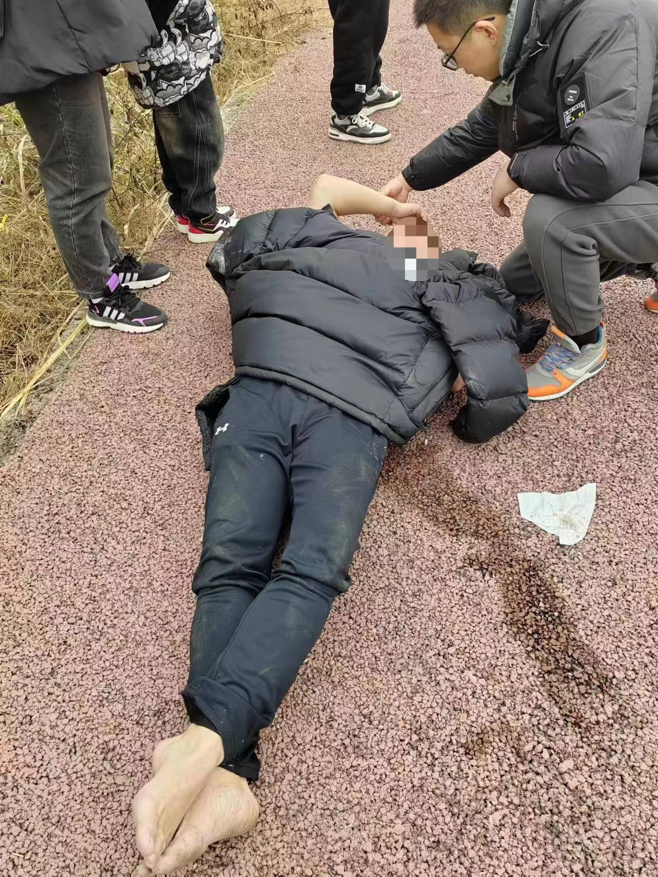当天15:30左右,路经温江区鲁家滩的彭伟发现前面人群聚集。彭伟意识到可能出了什么意外,便挤进人群。只见一名40岁左右的男子倒在地上,面色苍白。身为医务人员的他迅速上前对其进行救治。在得知家属已拨打了120后,彭伟一边劝走围观群众一边快速俯下身,双膝跪在地上,对倒地的男子进行身体评估,发现其心率高达170—180次/分,双眼充血。男子称自己头晕,四肢无力。彭伟立即协助该男子平躺呈仰卧位,头偏向一侧,避免突发心跳骤停误吸引起窒息,同时,他不断安慰病人,让其保持清醒。随后,他指挥围观的几名男士将男子轻轻搬到游客中心。彭伟知道游客中心有便携式AED(自动体外除颤器),如果发生心跳骤停,可以立即对其进行除颤和心肺复苏。