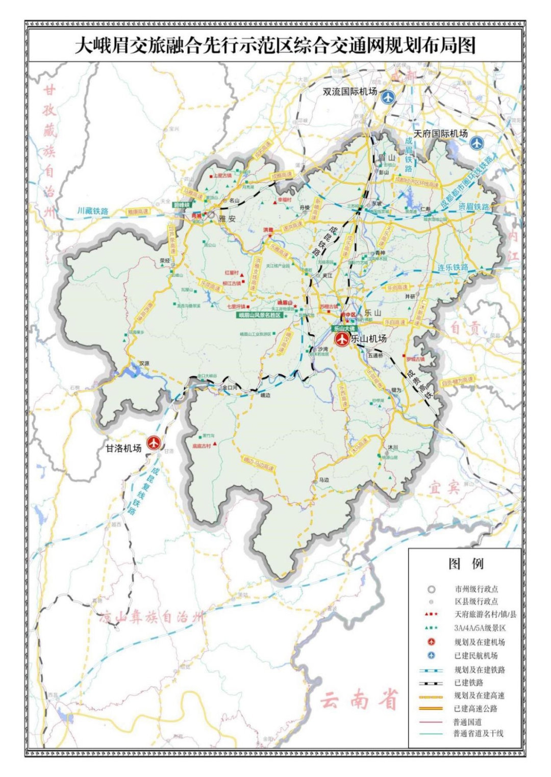 《大峨眉交旅融合先行示范区暨交通强市试点建设乐山行动方案》中明确:乐山要对外构建“四向五廊一机场”快进网,对内畅通“三环四带十一网”慢游网,实现全市4A级景区三级及以上公路全覆盖,基本实现高速公路出口至4A级景区30分钟通达、至A级景区1小时通达。