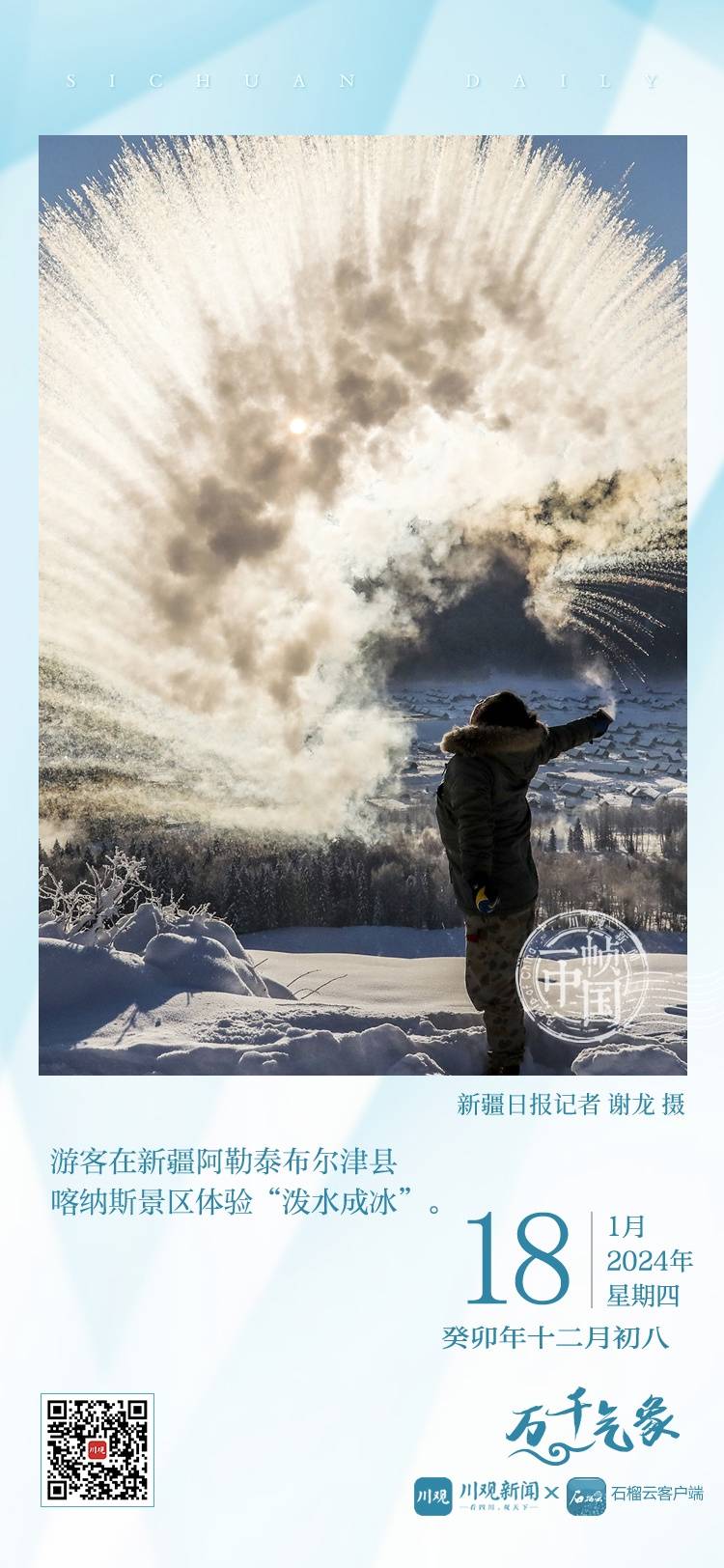 今天的《一帧中国》,川观新闻联合新疆日报石榴云客户端,带您来到新疆阿勒泰布尔津县喀纳斯景区,看游客体验“泼水成冰”的壮观景象。