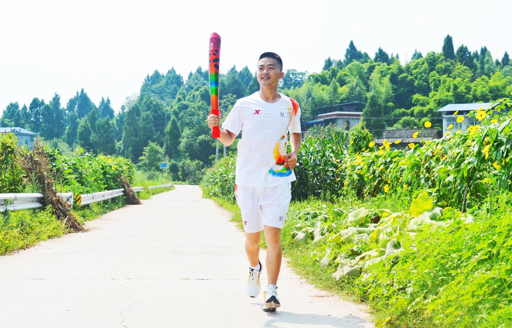 担任成都大运会火炬手的吴伟在乡间小路奔跑。马世杰 摄