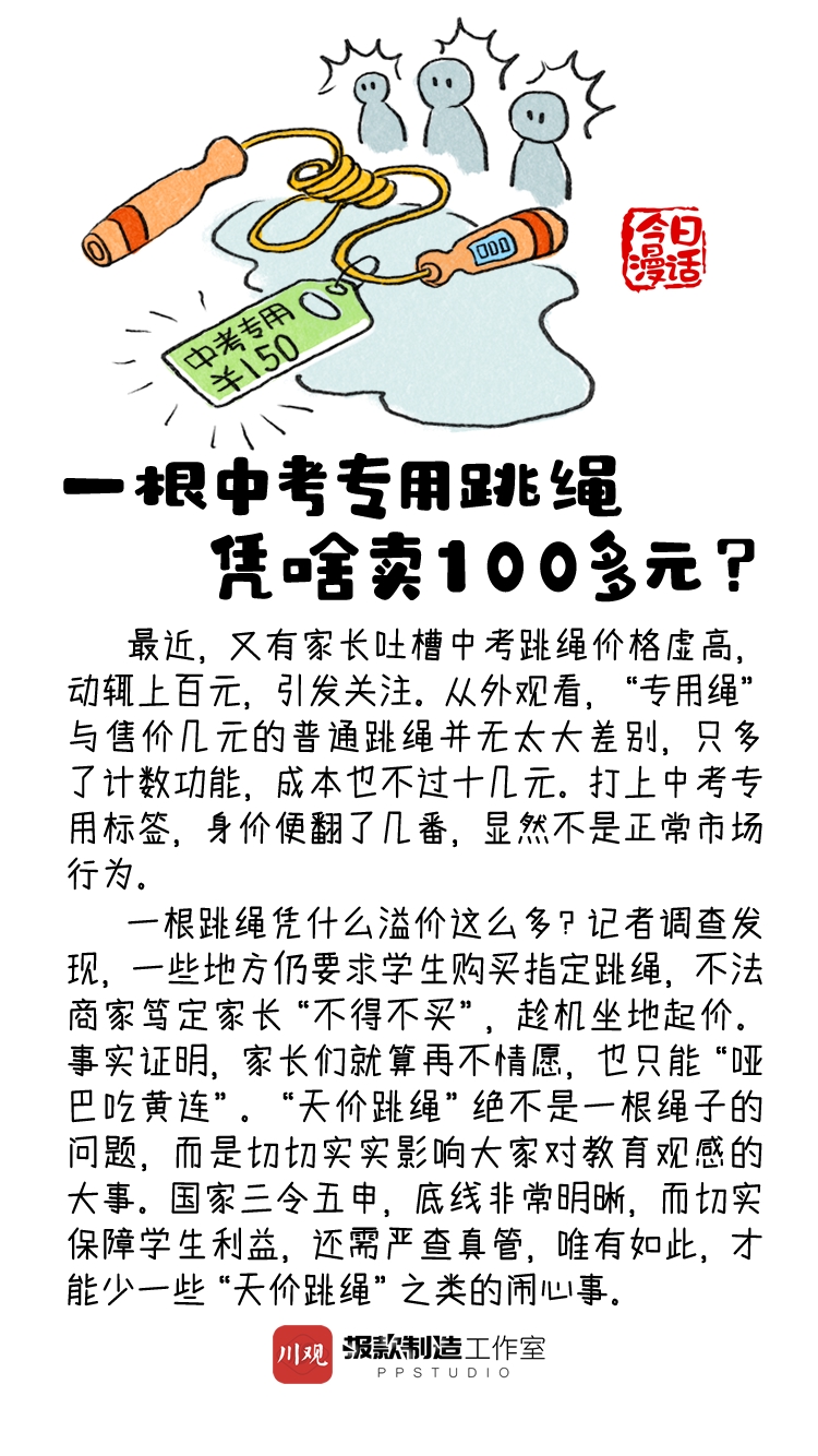 最近,又有家长吐槽中考跳绳价格虚高,动辄上百元。从外观看,“专用绳”与售价几元的普通跳绳并无太大差别,只多了计数功能,成本也不过十几元。但打上中考专用标签,身价便翻了几番,对此,你咋看?