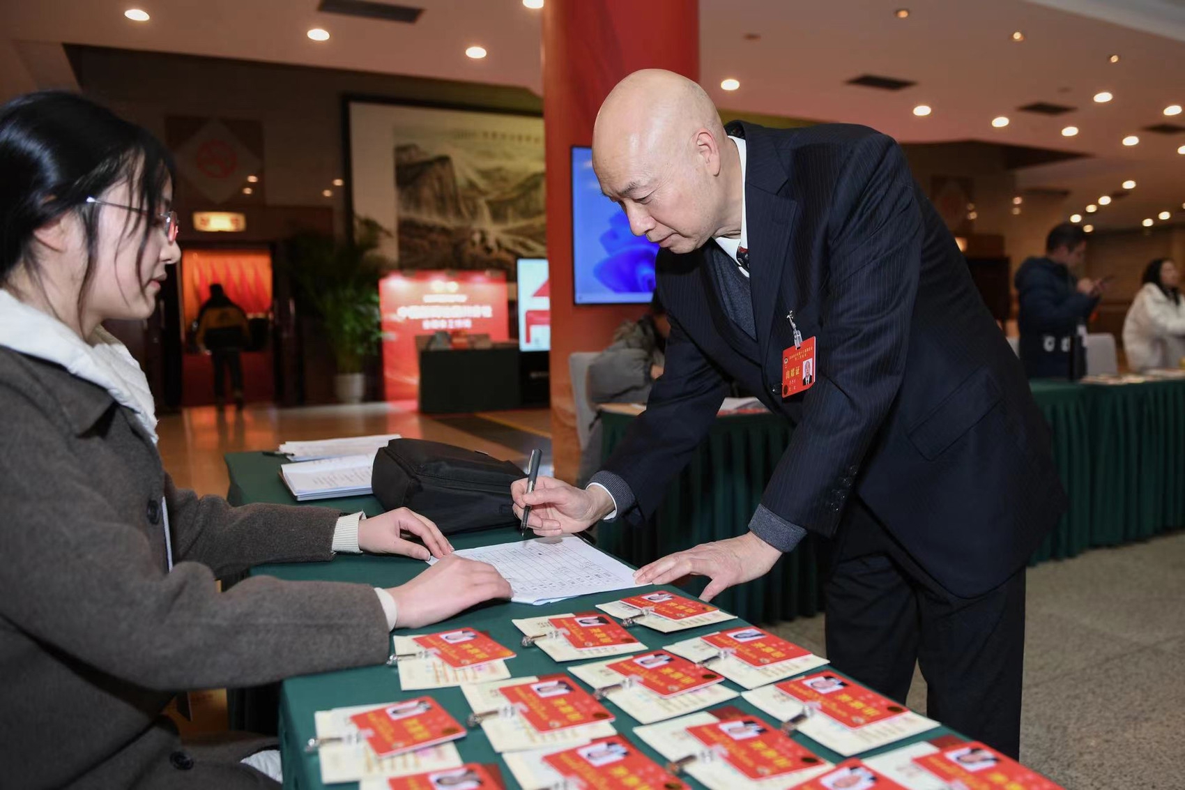 委员们正在报到。