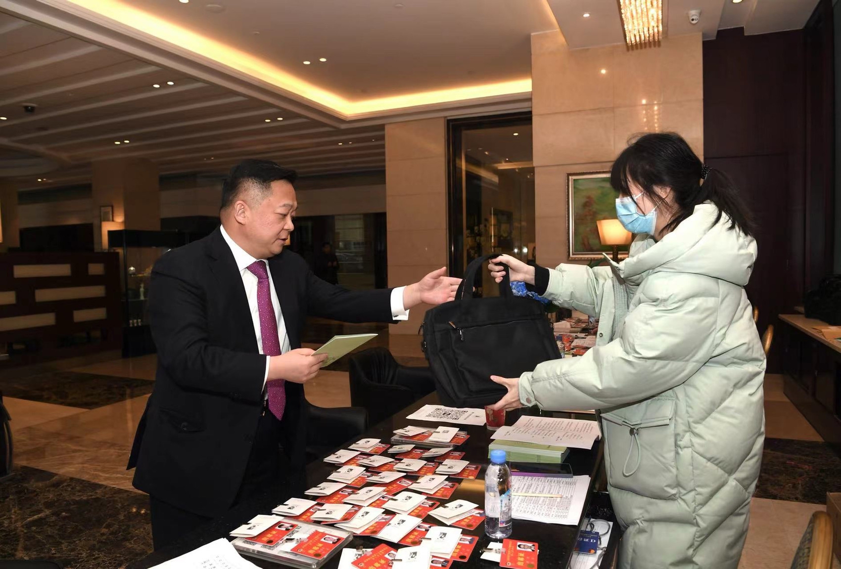 委员们领取证件。