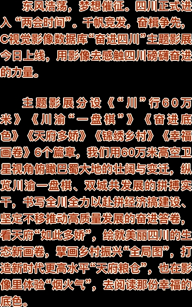 东风浩荡,梦想催征。四川正式进入 “两会时间”。千帆竞发,奋楫争先。C视觉影像数据库“奋进四川”主题影展今日上线,用影像去感触四川磅礴奋进的力量。