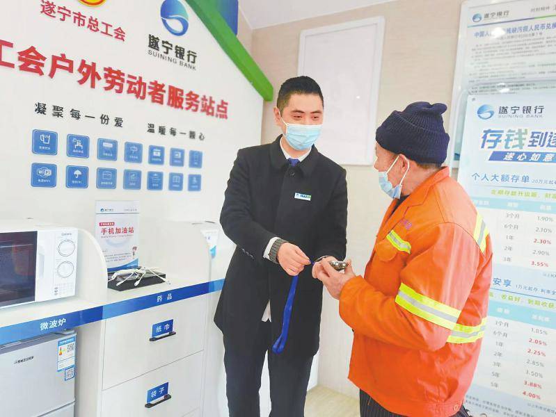 在遂宁银行栖霞路支行工会户外劳动者之家,工作人员将充好电的手机交还给环卫工人。