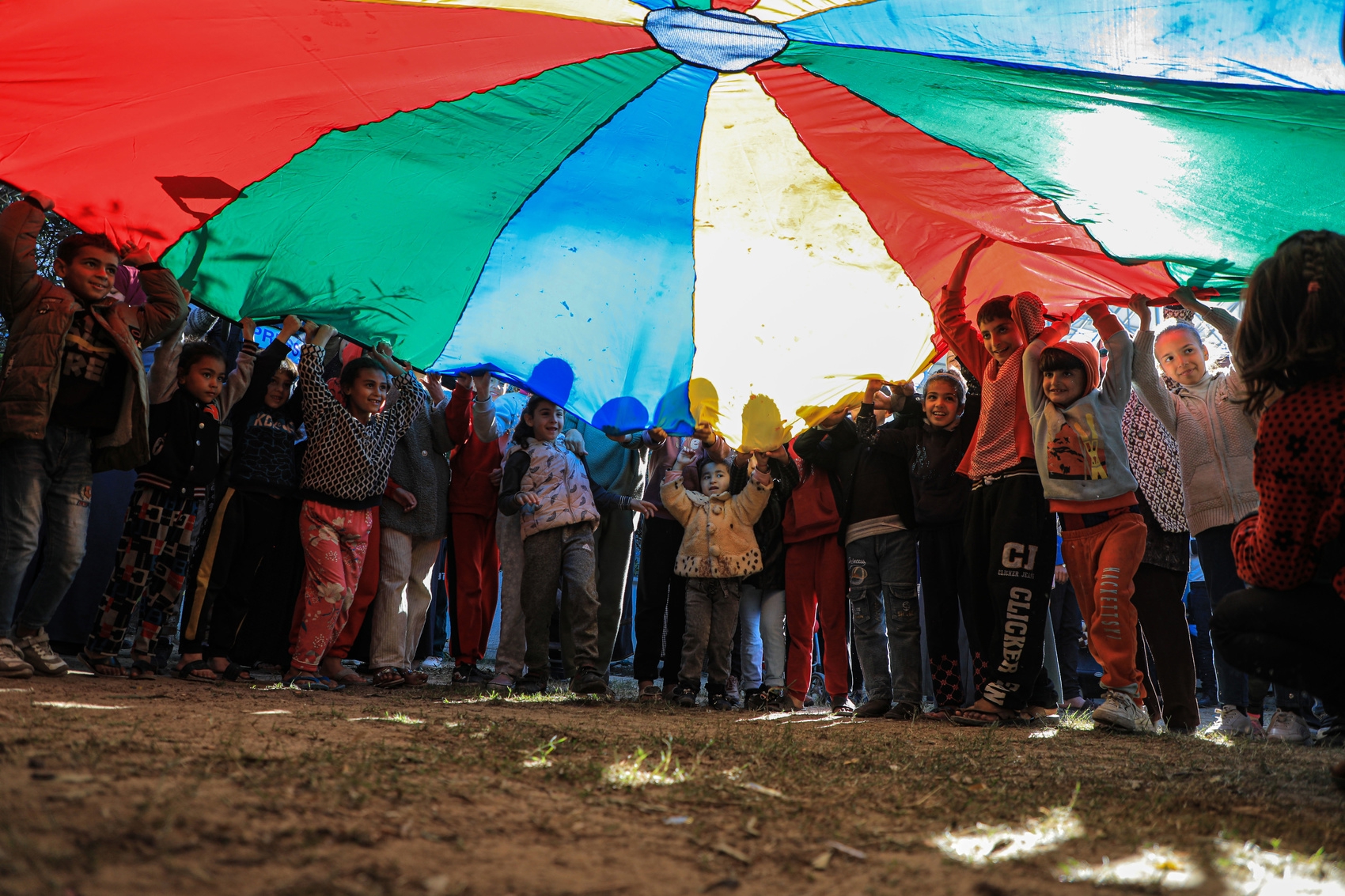 1月24日,在加沙地带南部城市拉法的一所学校内,孩子们参加当地志愿者组织的关爱儿童的活动。