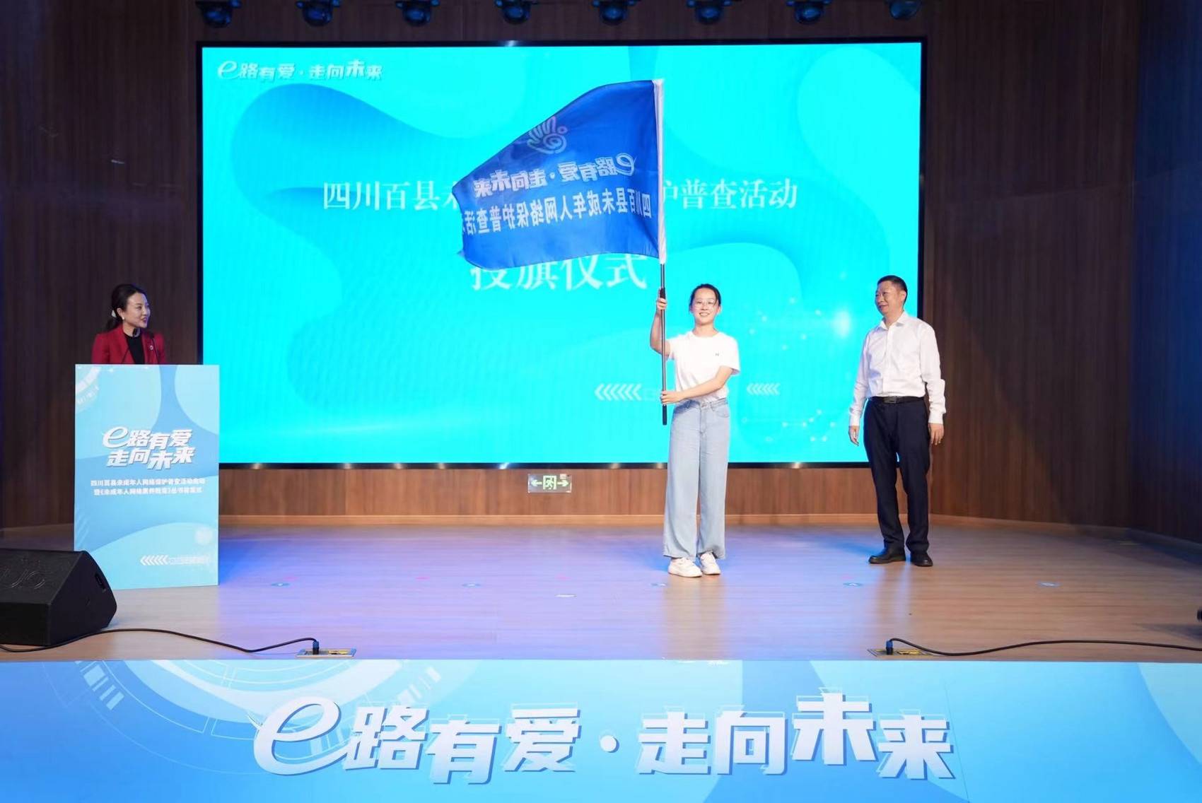 四川百县未成年人网络普查活动启动现场,未成年人代表接受旗帜。