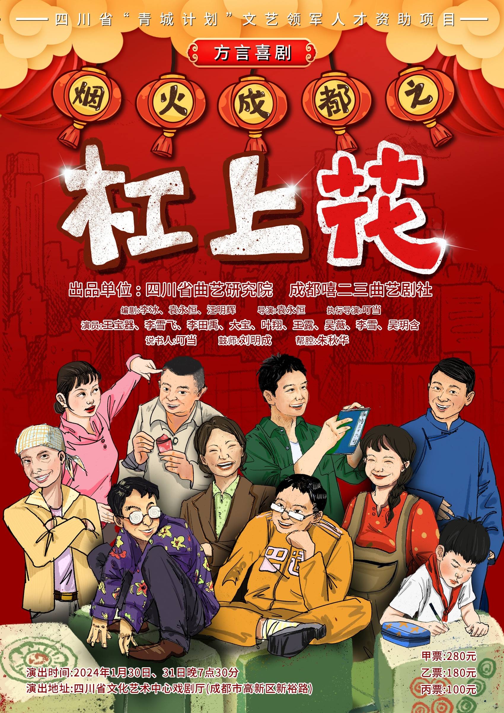 1月30日至31日,四川省曲艺研究院和成都嘻贰叁曲艺剧社联合出品的《烟火成都之杠上花》将在四川文化艺术中心上演。巴蜀笑星叮当(张旭东)、王宝器、李雪飞、李田禹、大宝等川内众多著名曲艺演员加盟,以爆笑喜剧展现烟火成都。
