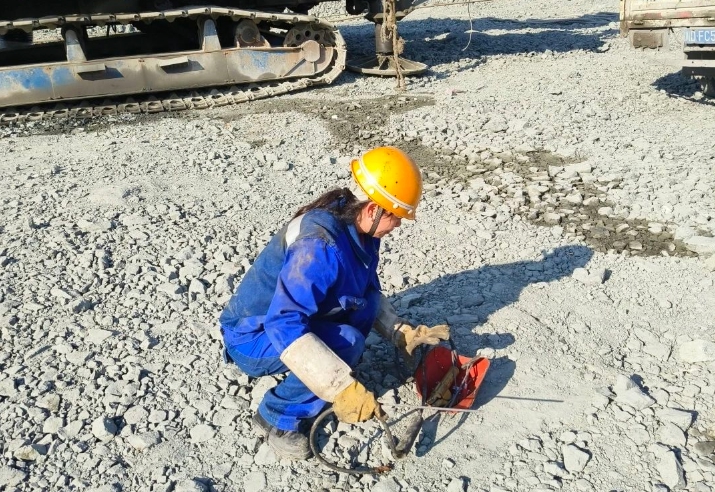 电铲、钻机,温馨每天要和20多台庞大的机器打交道。“有时候要窝到铲斗里面去,有时候要爬到18米高的爬架上,有时候要仰着焊,有时候要跪着焊,有时候要拗着各种姿势去适应空间。”温馨回忆,刚开始值夜班时,要在凌晨一两点穿过黑漆漆的采石场,“看不清路很容易摔倒,我心里害怕就捡起两块矿石,一边敲击着一边往前走。”