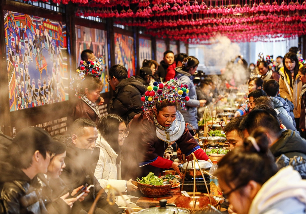 1月28日,在三江侗族自治县程阳八寨景区,游客在体验侗族百家宴。
