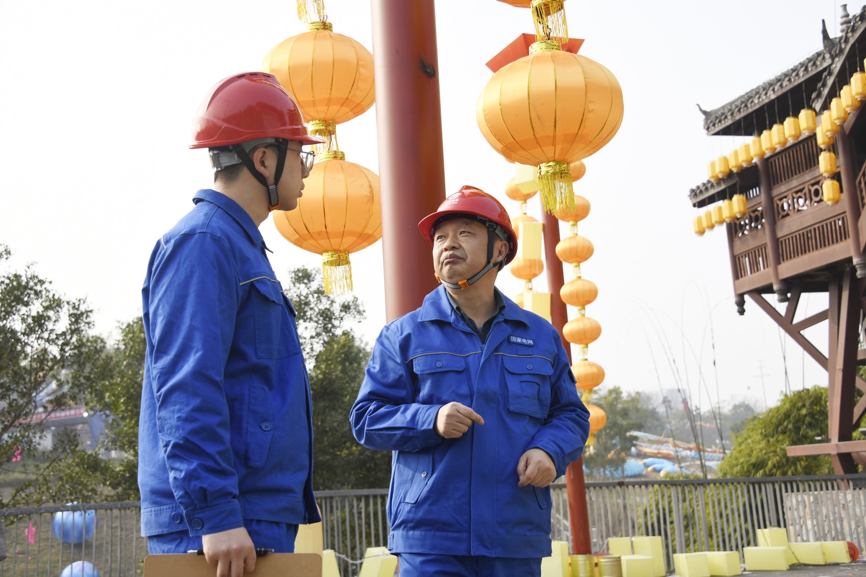 1月26日下午,在自贡市中华彩灯大世界,头戴红色安全帽、身穿蓝色工作服,国网自贡供电公司高级用电检查员孔晓林带着灯会保电“新兵”陶华欣在园区内进行用电巡视检查。“在彩灯最后的安装阶段,我们重点检查每一组电线接头是否分路分开包扎,灯组支架是钢结构的要严格接地。”孔晓林一边传授经验,一边在本子上做着记录。