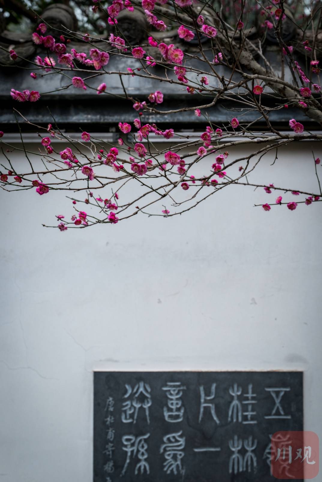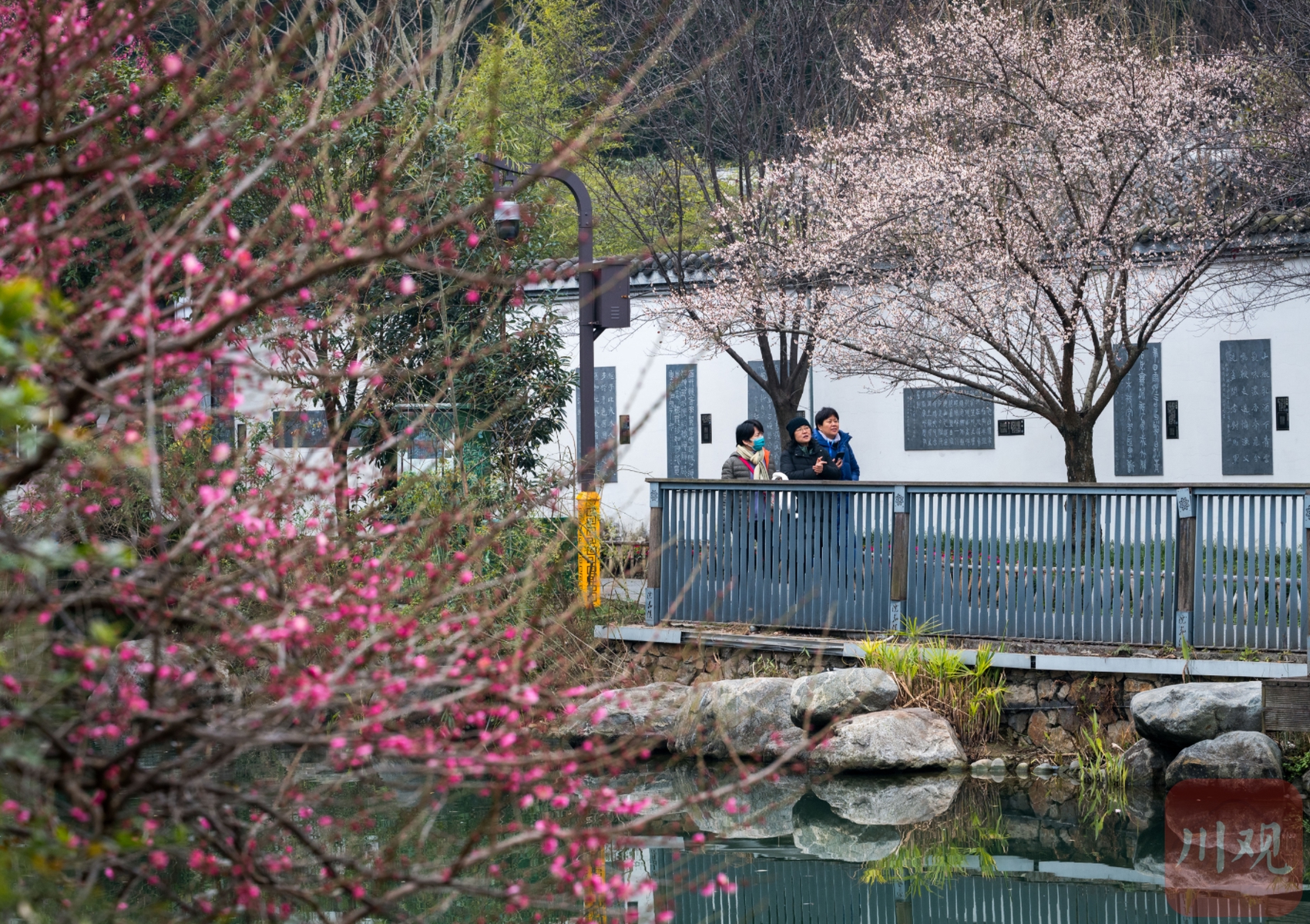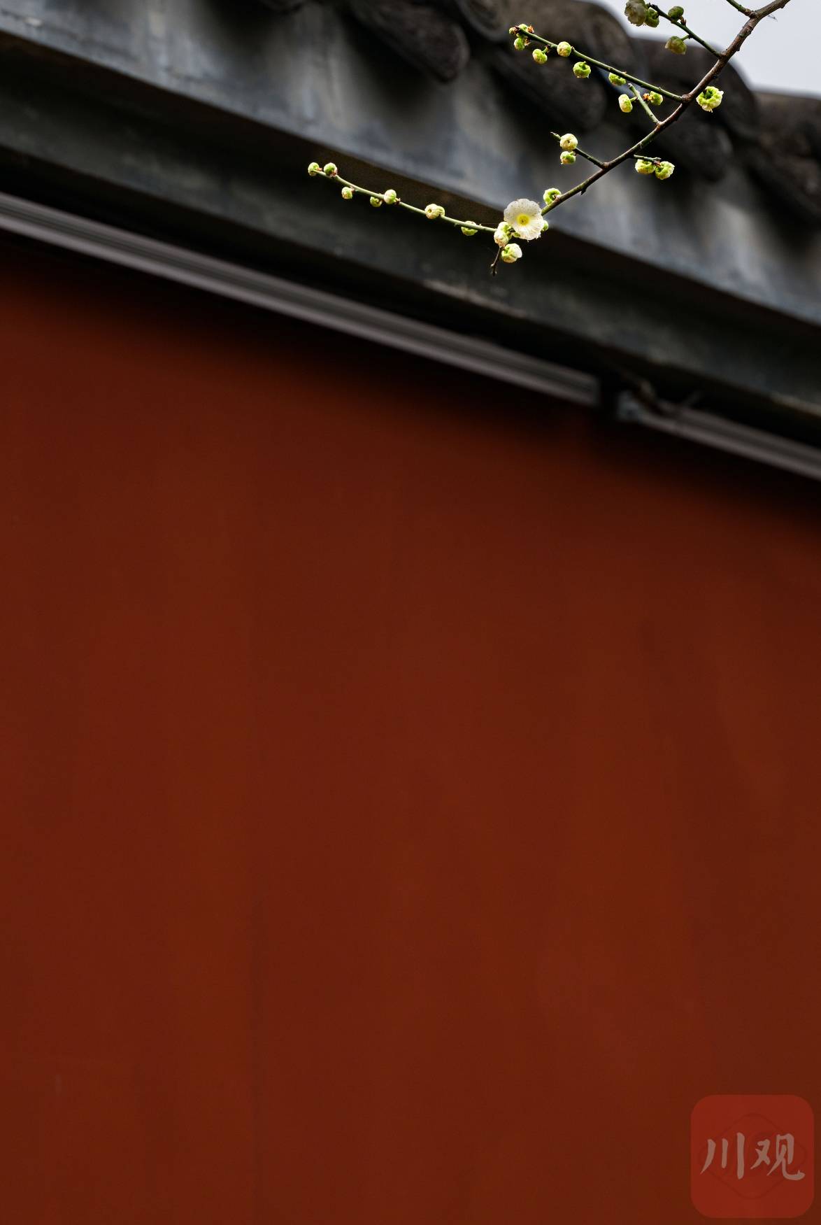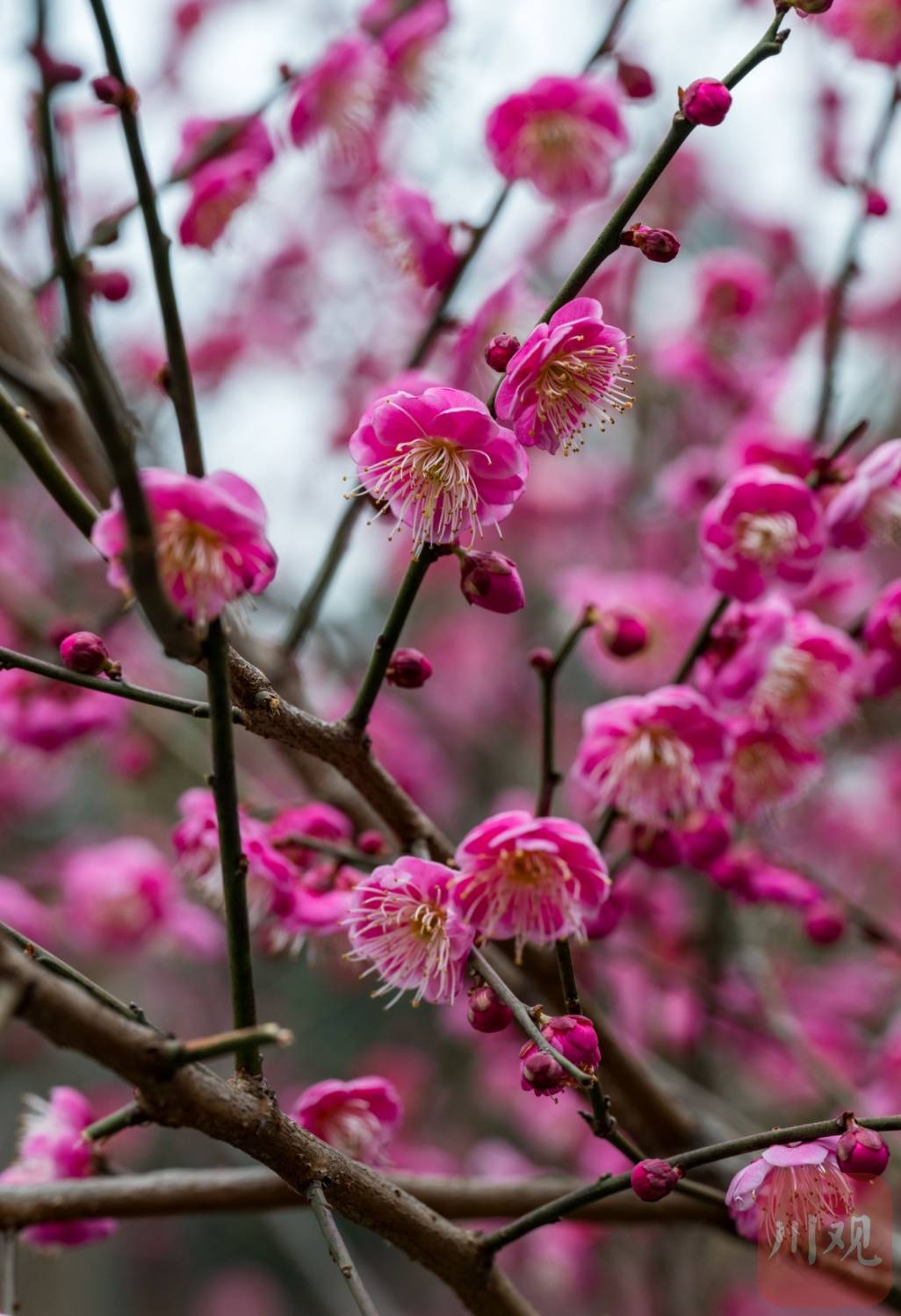 浣花溪畔万点红,1月30日,成都市浣花溪公园不少梅花已经开放。溪中的石桥、亭台、楼阁、流水与梅花相配,游人在其中体会“二十里中香不断,青羊宫到浣花溪”的意境。