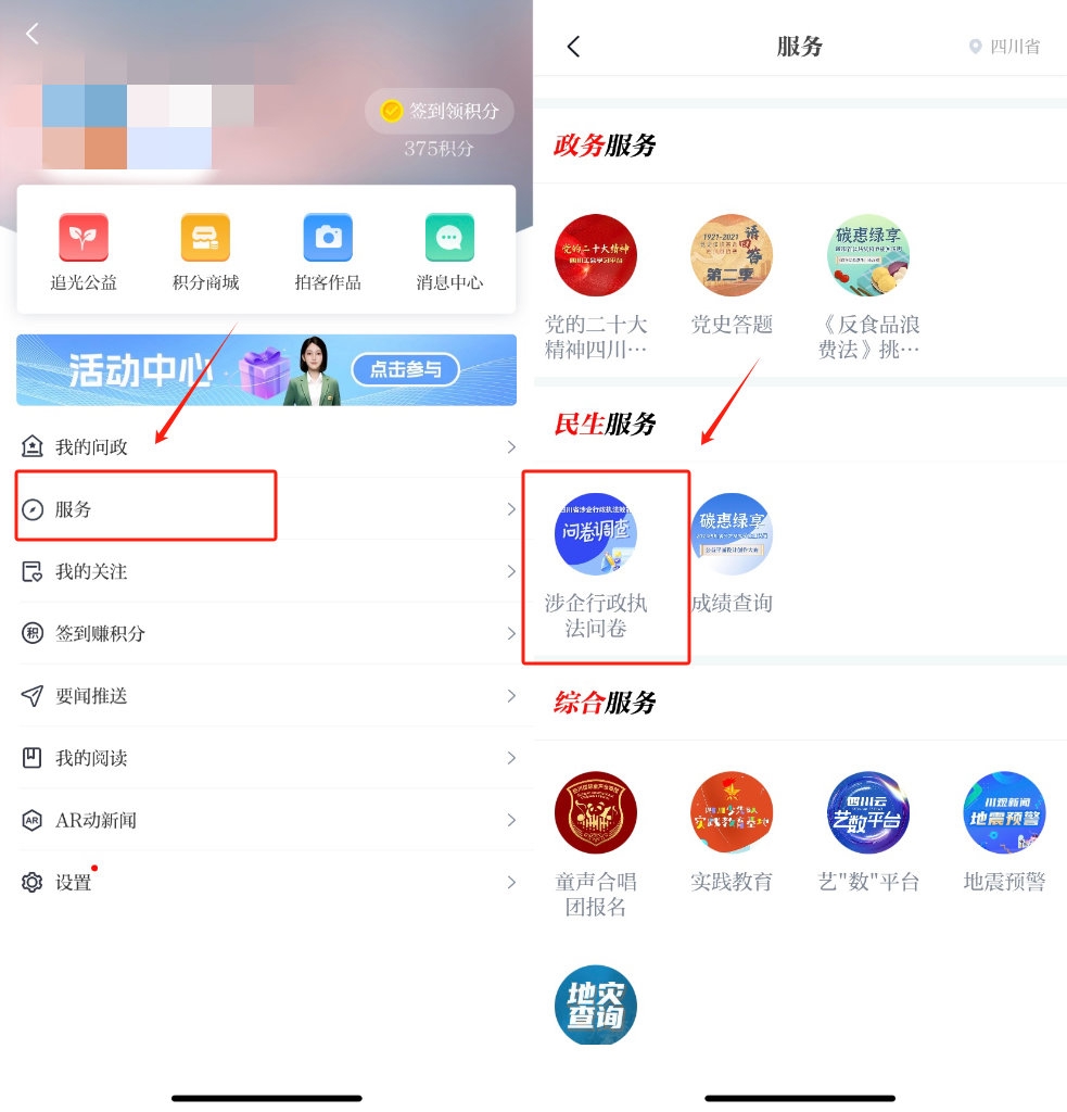 2.在川观新闻主页的右上角点击你的头像进入用户主页,点击“服务”-“民生服务”-“四川省涉企行政执法效能问卷调查”。