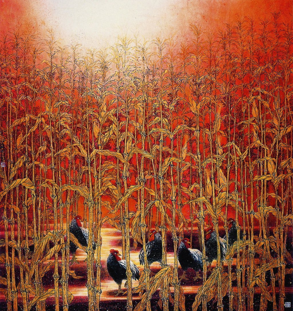 《包谷林》是四川省美术家协会主席梁时民的成名作,完成于2002年,“在改革开放的时代背景下,如何用花鸟画的形式呈现祖国的繁荣昌盛成为了创作的立足点,最终我选择了一片玉米地作为画面背景,就是后来大家熟知的《包谷林》。”为了让画面更富生机,艺术家用几只雄鸡穿插其间,同时在背景中加上了一条白色的、弯弯曲曲的河,增强画面纵伸感,让包谷林看起来更加深邃。红色、黄色、黑色等丰满的色彩搭配,点、线、面巧妙的组合,使画面充满和谐之音,玉米地上方的一束阳光,沐浴着祖国的大地,表现出一片欣欣向荣,繁荣昌盛的气息。
