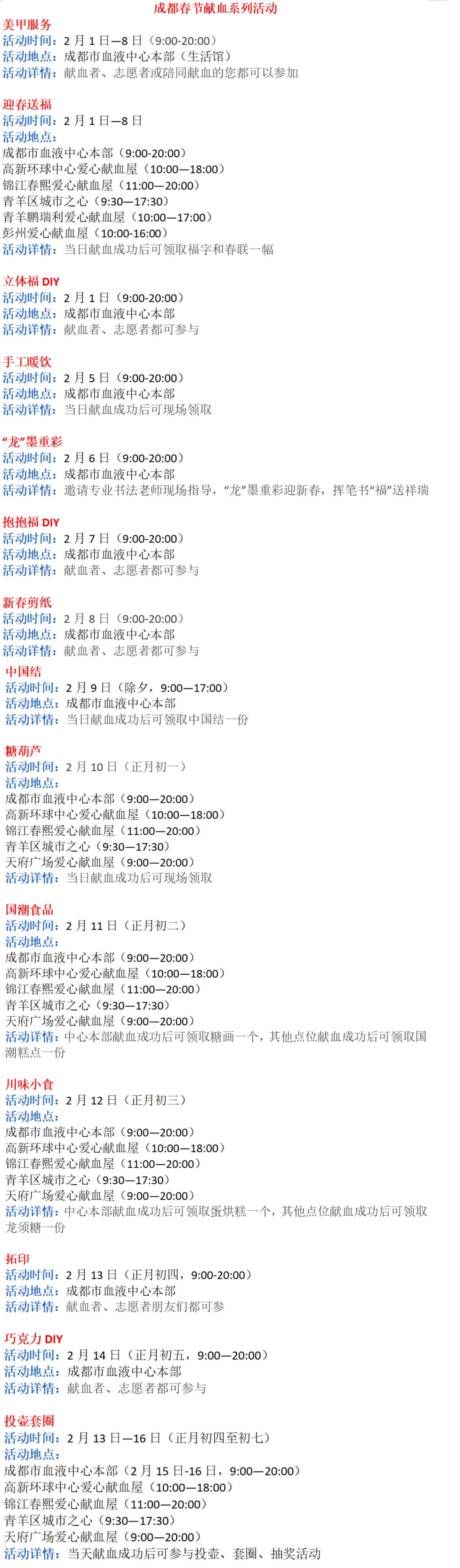 值得一提的是,成都市多个献血点位还为献血者、志愿者准备一系列丰富有趣的暖心活动——如免费的美甲服务、书法互动活动等,还可择日领取抱抱福桶、中国结、糖葫芦、福字、春联、手工暖饮、蛋烘糕、龙须糖、拓印等。