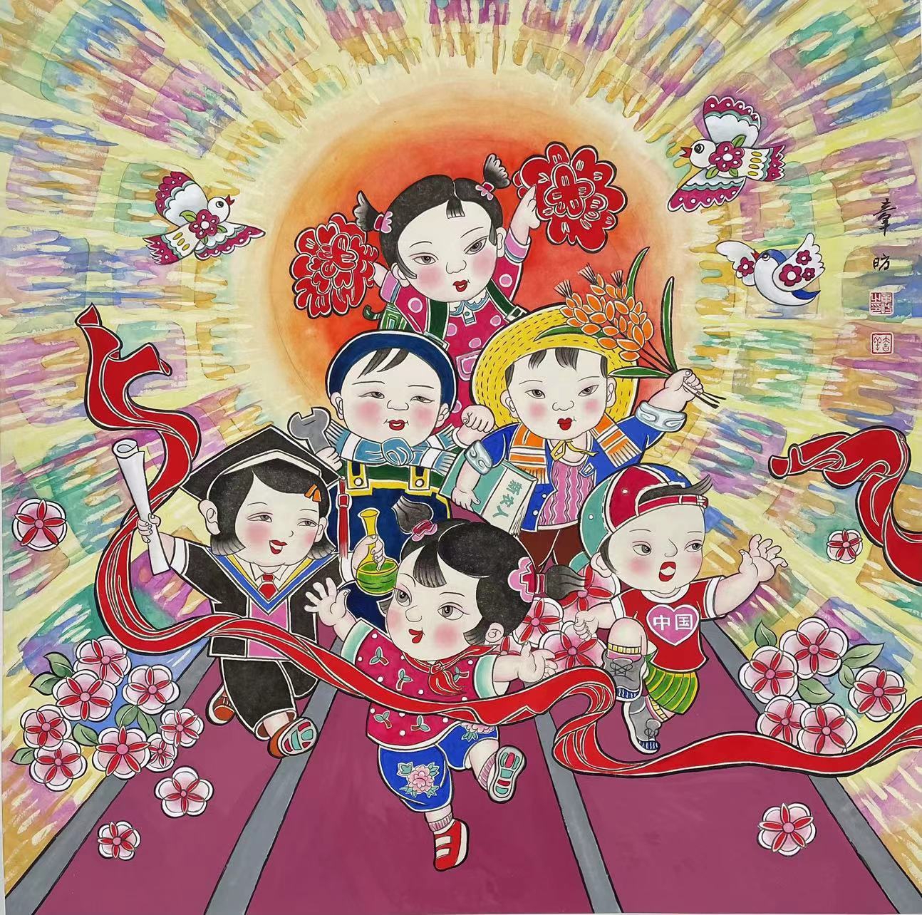 作为绵竹年画青年代表性传承人,章昉此次也有作品《金句——我们都在努力奔跑,我们都是追梦人》入选。她介绍,作品在创作技法上,采用 “一黑二白三金黄,五颜六色穿衣裳”的绵竹年画传统绘制技法。“浓墨重彩,保持了绵竹年画的地域特征。”章昉说,作品饱满艳丽、生动活波,表现出了新时代年画的蓬勃活力。