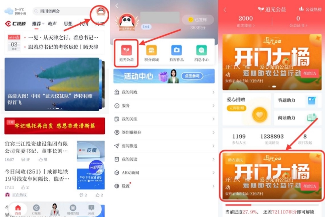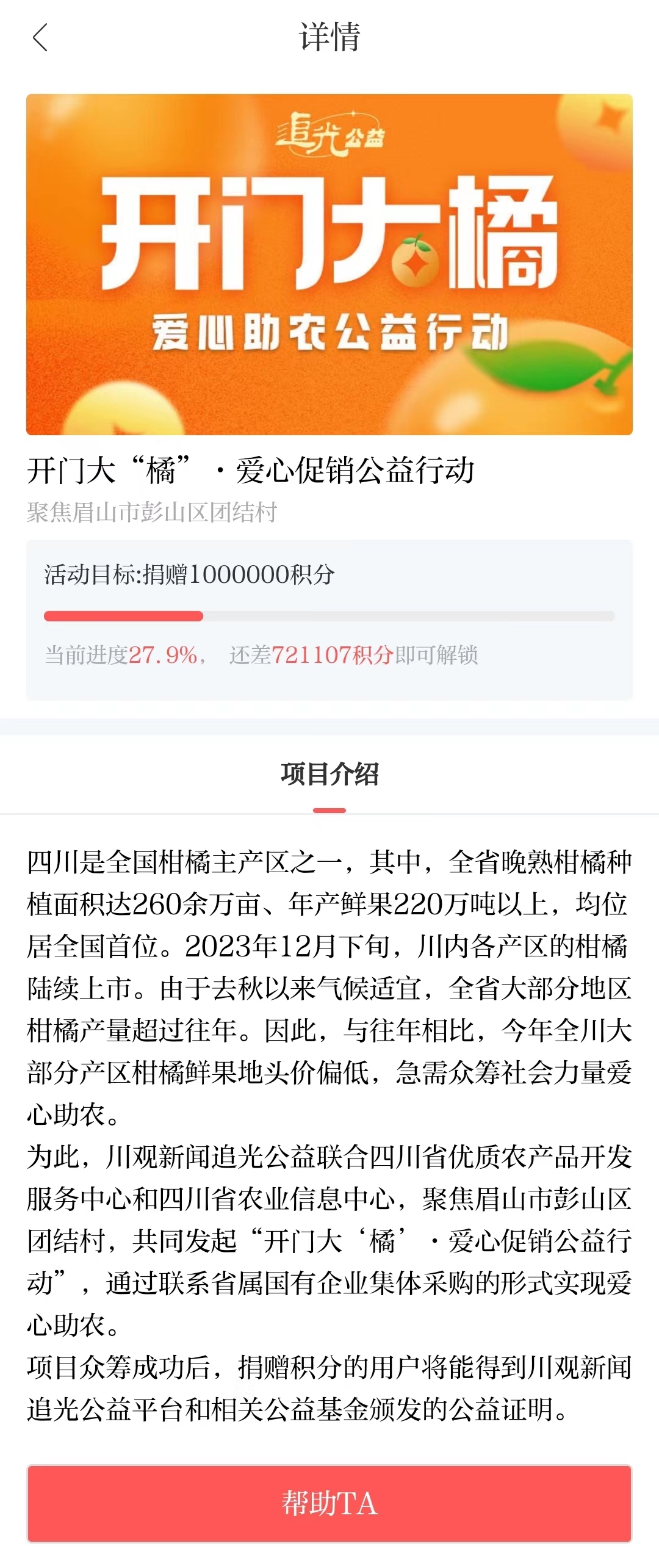 【第二步】在川观新闻首页,“我的”版块,点击“追光公益”,找到“开门大‘橘’·爱心促销公益行动”活动专区,即可进行积分捐赠。