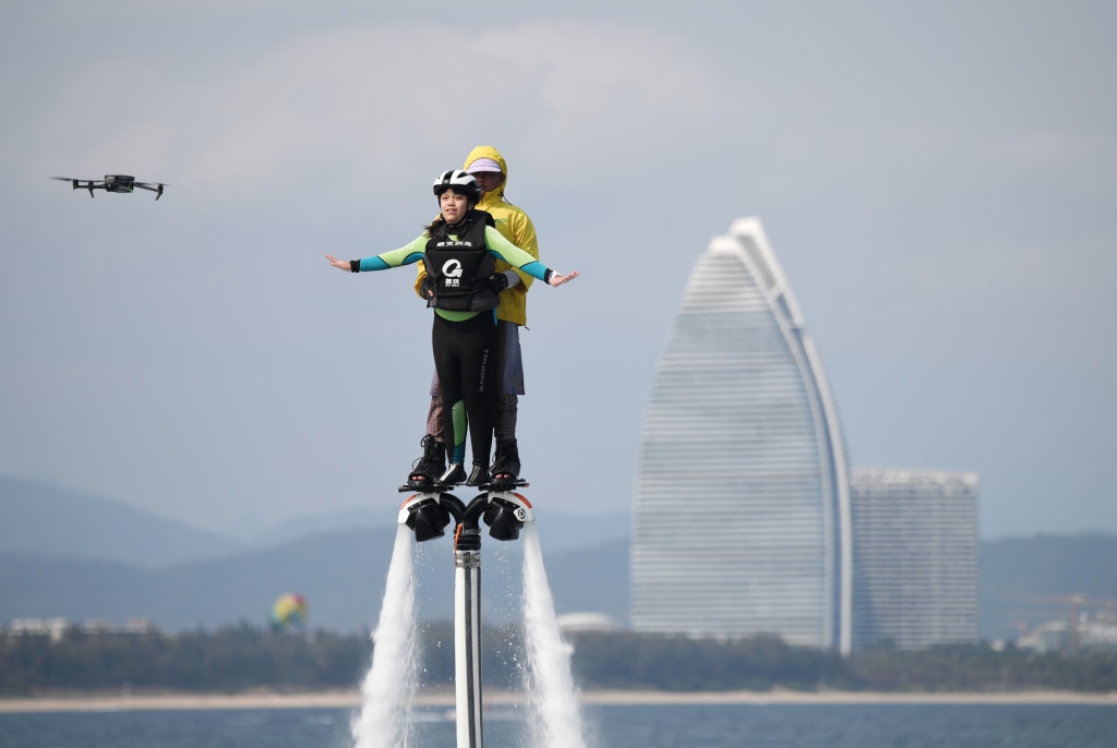 2月4日,在海南省三亚市蜈支洲岛旅游区,游客体验动感飞人项目。