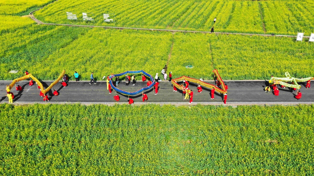 2月4日,在兴义市万峰林景区,民间艺人在油菜花田间道路上表演舞龙(无人机照片)。