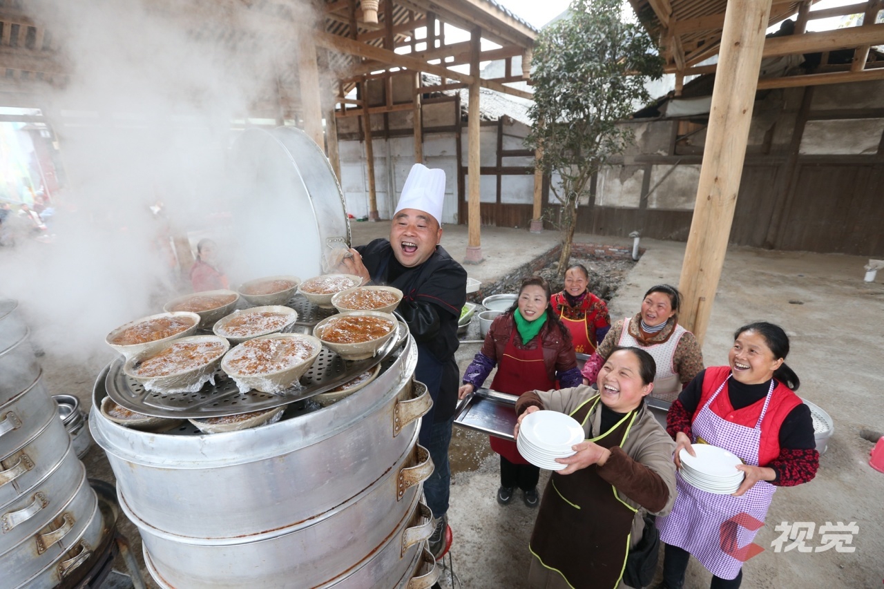 广安市武胜县宝箴塞镇方家沟村的村民和游客在当地的段家大院内共享“庖汤”宴,喜迎新年。