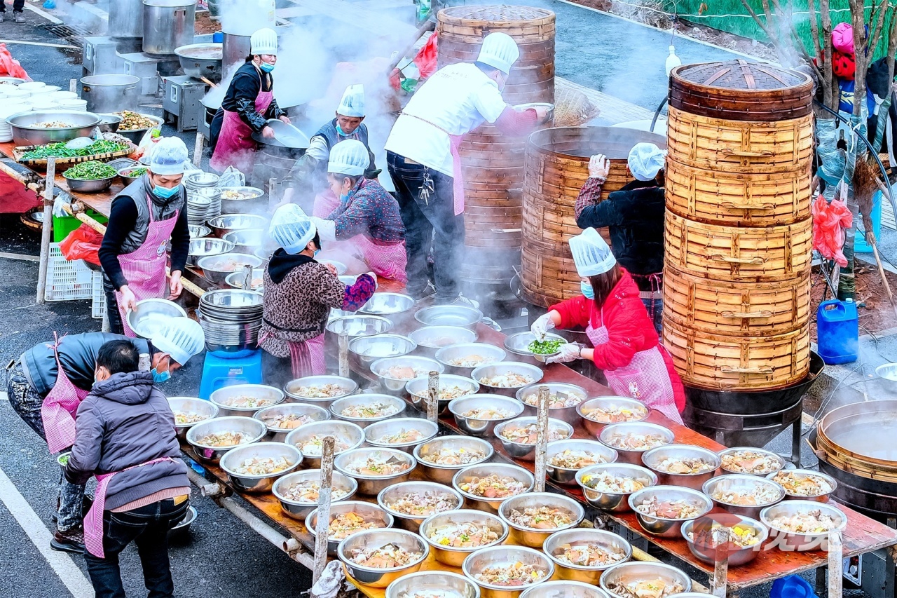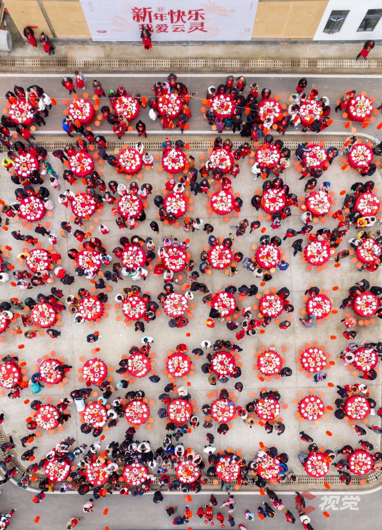 宜宾市长宁县长宁镇洪谟社区紫竹小区,130户居民欢聚一堂,吃坝坝宴,共叙邻里情,喜迎龙年新春。