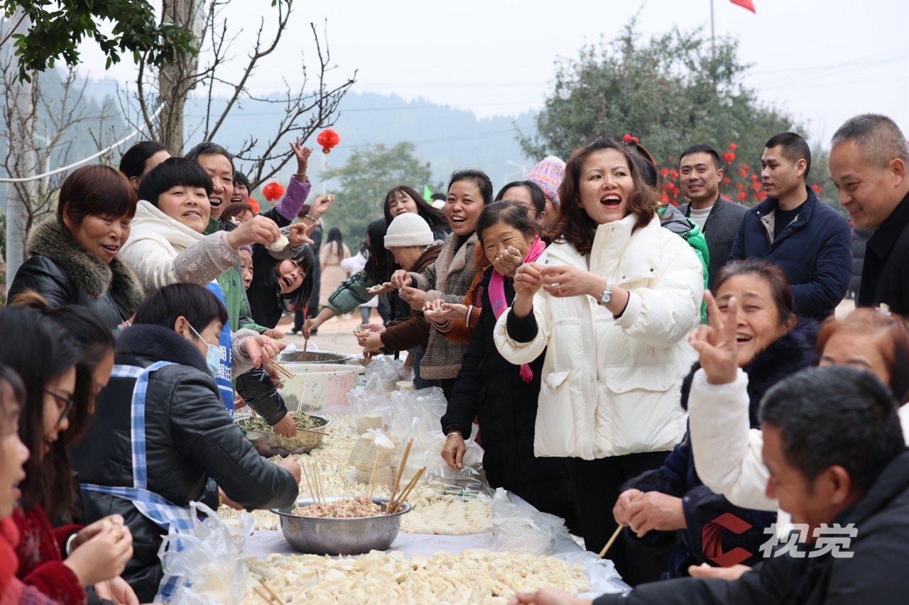 遂宁市河东新区云灵新村举办趣味文化活动,294户新村居民团聚在一起,以吃庖汤,看歌舞,吃糖人,摸“福”字等方式,一同迎接龙年春节到来。