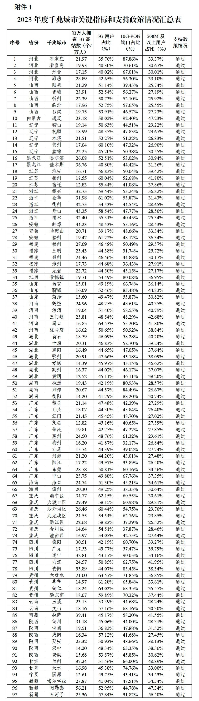 据工信微报微信公众号消息,工业和信息化部近日通报2023年千兆城市建设情况,全年新增97个城市达到千兆城市标准,完成千兆城市总结评估工作。从区域分布看,东部地区新增27个千兆城市,中部地区新增38个千兆城市,西部地区新增32个千兆城市。