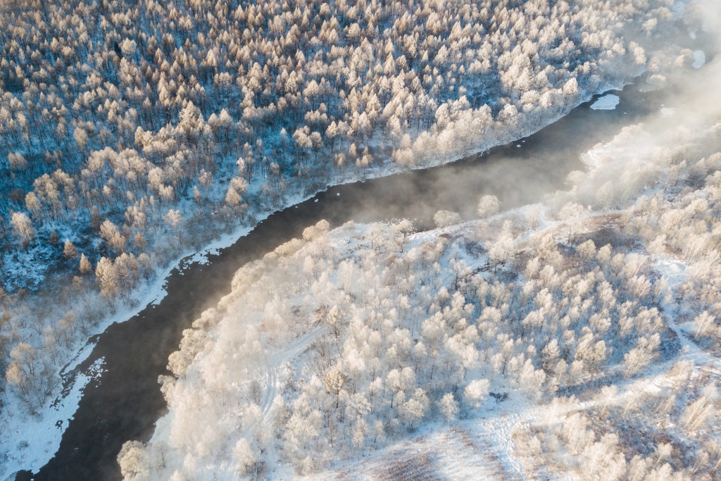 立春已过,地处黑龙江省北部的逊克县克林镇平台村仍寒意逼人,氤氲水汽在低温中升腾,凝结在沿岸的树枝之上,造就了绵延十余公里的雾凇梦幻景观。