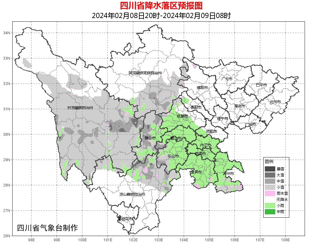 今天晚上:成都、雅安、眉山、乐山、内江、自贡、宜宾、泸州8市阴天有小雨或零星小雨,高海拔山区有雨夹雪或小雪,局部地方有中雪,盆地其余地方多云;甘孜州、阿坝州东南部和凉山州北部阴天间多云有阵雪(雨),局部中到大雪,阿坝州和攀西地区其余地方多云间晴。