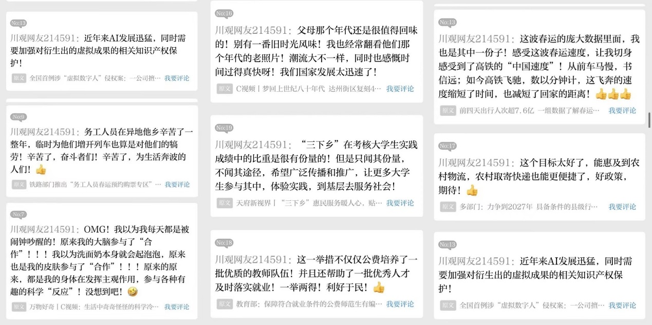 “遇到自己感兴趣的新闻话题,写下评论,就像一种记录,是我的一种放松方式。”吴女士说,近期自己最关注两会、就业、春运等话题,遇到科研创新的,也会忍不住写上两句。“休闲、好玩的也看一些。”