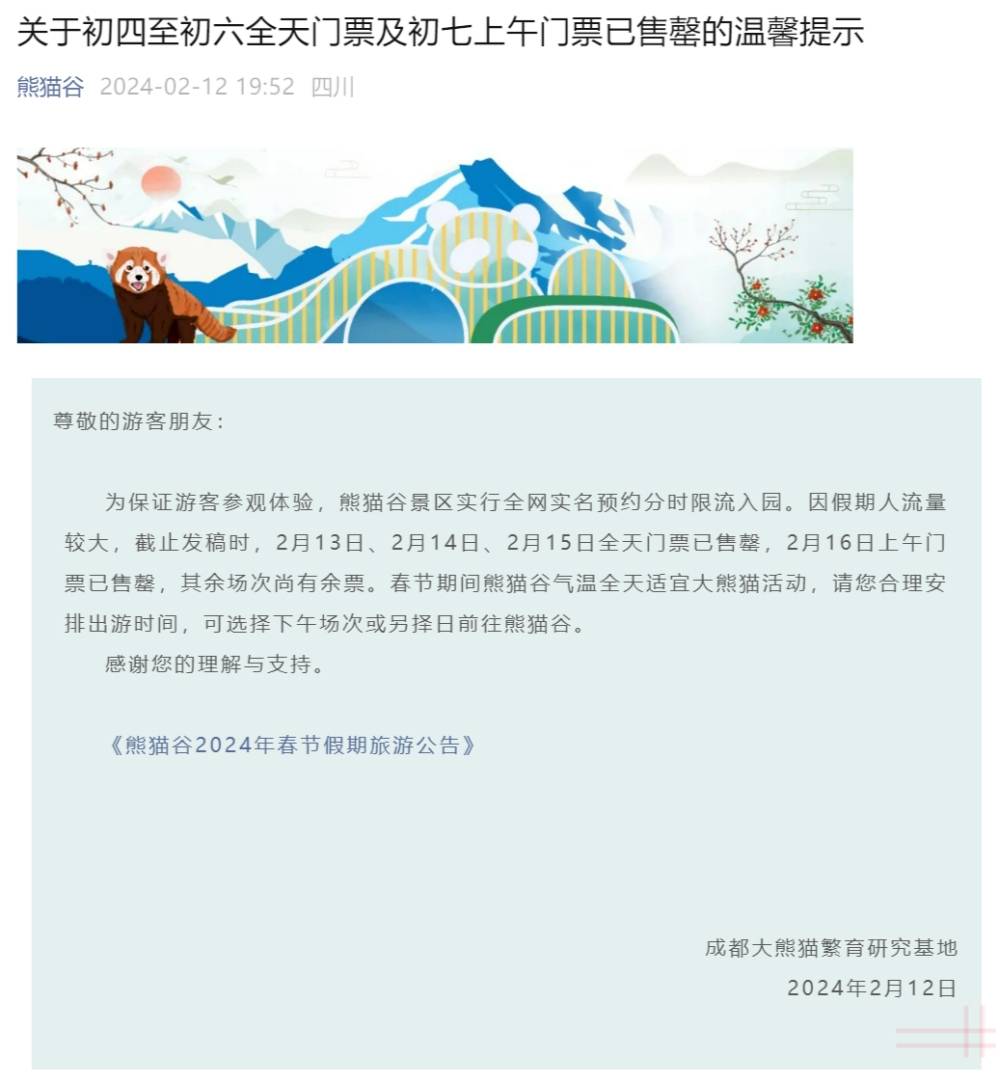 据熊猫谷2月12日晚公告,因假期人流量较大,截至当日发稿时,2月13日、2月14日、2月15日全天门票已售罄,2月16日上午门票已售罄。春节期间熊猫谷气温全天适宜大熊猫活动,请您合理安排出游时间,可选择下午场次或另择日前往熊猫谷。