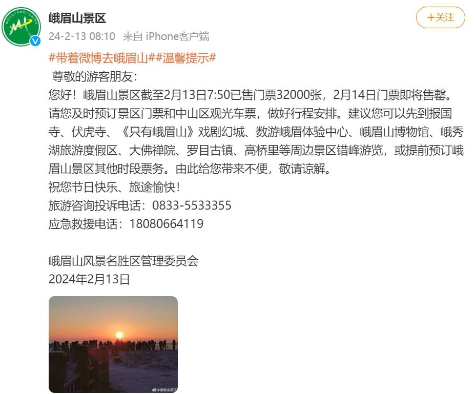 据峨眉山景区,峨眉山景区截至2月13日7:50已售门票32000张,2月14日门票即将售罄。请您及时预订景区门票和中山区观光车票,做好行程安排。建议您可以先到报国寺、伏虎寺、《只有峨眉山》戏剧幻城、数游峨眉体验中心、峨眉山博物馆、峨秀湖旅游度假区、大佛禅院、罗目古镇、高桥里等周边景区错峰游览,或提前预订峨眉山景区其他时段票务。