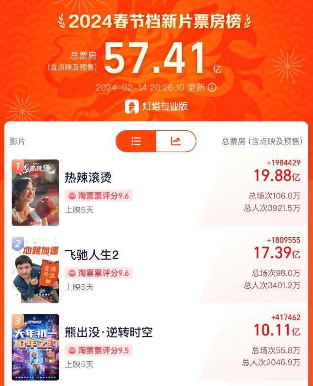 龙年春节已过半,电影市场节节高。据灯塔专业版数据显示,截至发稿前(北京时间2024年2月14日20时26分,2024年春节档(2月10日至17日)总票房(含预售)突破50亿元,达到了57.41亿元,观影人次突破1亿人。目前,《热辣滚烫》《飞驰人生2》《熊出没·逆转时空》位列春节档期票房前三位。