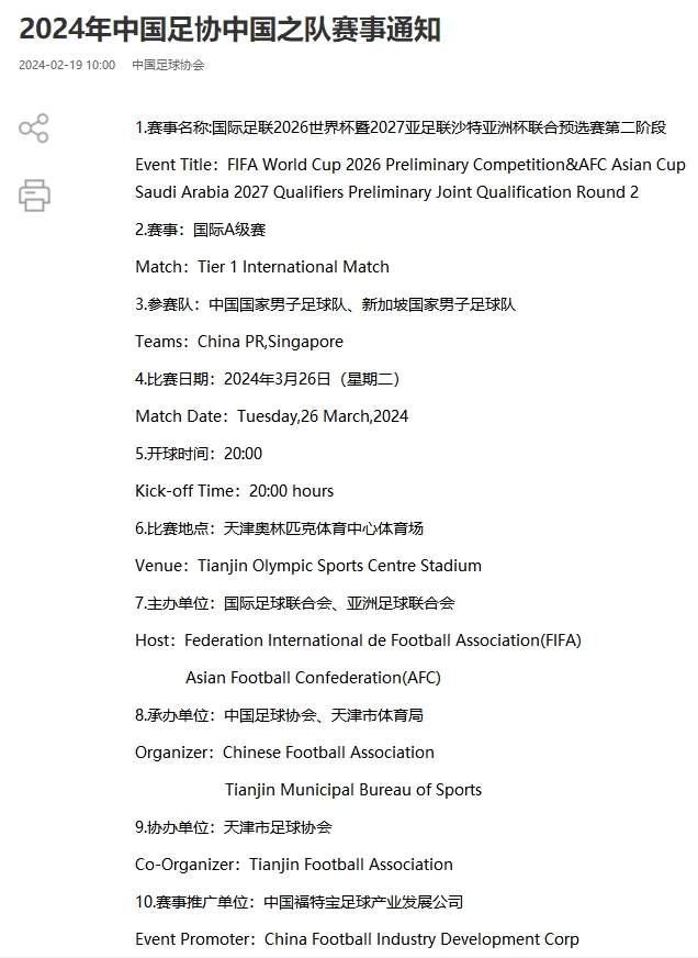 2月19日上午,中国足协官宣,中国男足参加2026美加墨世界杯预选赛36强赛主场与新加坡队的比赛,将于3月26日在天津奥体中心体育场(水滴)进行,这是天津时隔16年再次承办国足世界杯预选赛主场比赛,也将是国足第三次在天津迎战新加坡队,前两次国足分别以1比0和6比1取胜。